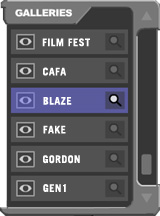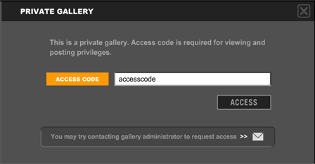entering Gallery section, by default you'd be in Public Gallery (an open Gallery) first. To select a different gallery, you press Gallery List Button to open the Gallery Selector menu (see picture at the top of this page). The Selector is a drop down menu lists all available galleries in the system (see picture above, Gallery Selector on the left). You move your mouse through the list to select one you want and you'd be taken to that gallery. If your selection is an Open gallery you'd be in the List view of that gallery directly. If your selection is a Private gallery you'd see a Private Gallery Access screen (see Private Gallery sample screen above) for you to enter its access code. You may enter a Private gallery only after your access privilege being verified .
