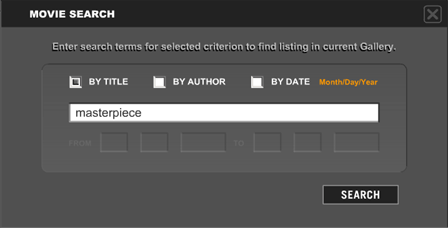 Gallery Selector UI also doubles as a Gallery Search Selector (see picture above, Search Selector on the right). When you move your mouse to the "magnifier" symbol at the right of a listing, you'd see the strip color changed to blue. Now click on the "magnifier" button it'd take you to the Search interface of respective gallery (see Movie Search sample screen below).