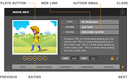 When you double-click the thumbnail of a movie listing from List View, a Movie Info panel (see sample screen below) of the same listing will come up replacing the List Window interface. This is the Movie View of a gallery list. It is an alternative way for browsing of gallery contents. You can navigate through the gallery list by clicking NEXT or PREVIOUS buttons to advance or back-step the list one movie at a time. On each movie panel it displays a postcard picture of the movie and a short description of what it is about. The Movie View is designed to highlight thematic contents of individual movie instead of browsing oversight. The panel not only provides more information about individual movie but also offers connectivity for a wider range of social network capability. See it as a launch pad or gateway to what are yet to happen. Switching back to List View is easy, simply press the CLOSE button to return to the List Window UI. You have the best of both worlds!