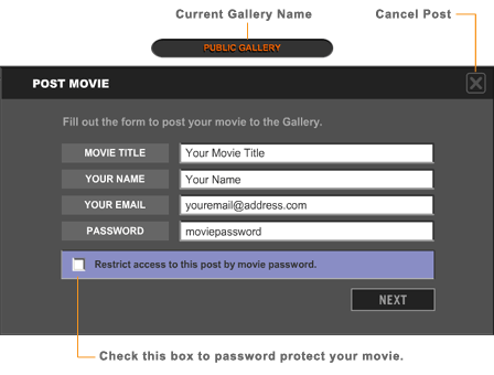 share and exchange your movie(s) with other Comixware users online by posting it to various Comixware galleries. NOTE: You can post your movie to any Open gallery. But you need access privilege to post to a Private gallery.