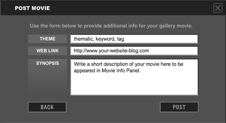 The next POST MOVIE screen is for you to supply additional information for your movie. It is to be used in Movie Info Panel for viewer to learn more about your movie and provide you additional means for web connectivity. Information for these fields (Theme, Web Link and Synopsis) are optional.