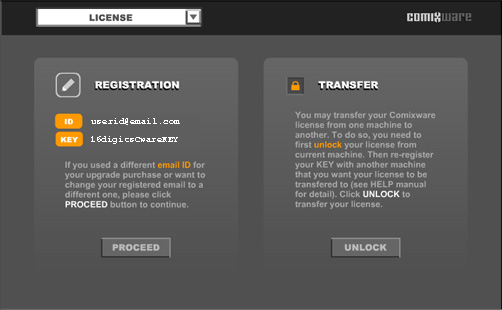 Your contact e-mail address is used to register your Comixware license in connection with a software KEY. You need both validated to run your copy of Comixware. This registered ID and KEY is displayed under Registration in License panel (see screen sample above). If you use a new e-mail address in association with Comixware you should update your KEY accordingly. Simply go to License Panel and click PROCEED button to make the change. This is especially important when you buy an add-on with a different e-mail ID in a later time. In such case, if you didn't update your registration accordingly your new purchase(s) will not show up in the Upgrade list and therefore not be available for installation.