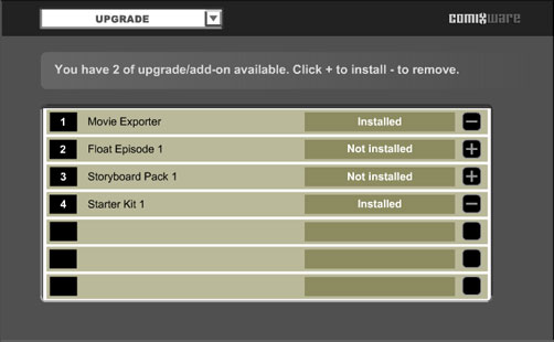 Launch the Comixware and go to Upgrade panel in Options section. You should be able to see the module you purchased (along with all other modules that you have a license for) appeared in the Upgrade list. A plus (+) sign on the module strip means it's not installed. A minus (-) sign means it's already installed. See sample screen above.
